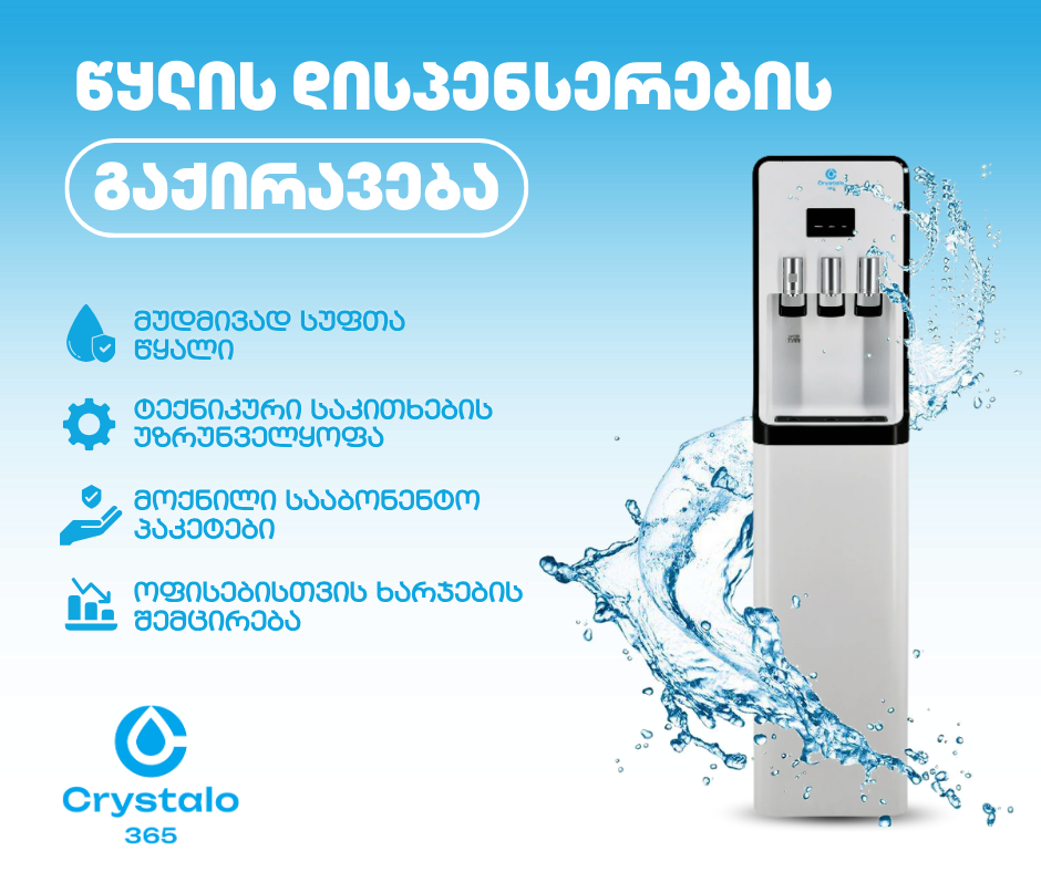 Crystalo365 ორგანიზაციებს სთავაზობს წყლის დისპენსერების გაქირავებას სააბონენტო მოდელზე.